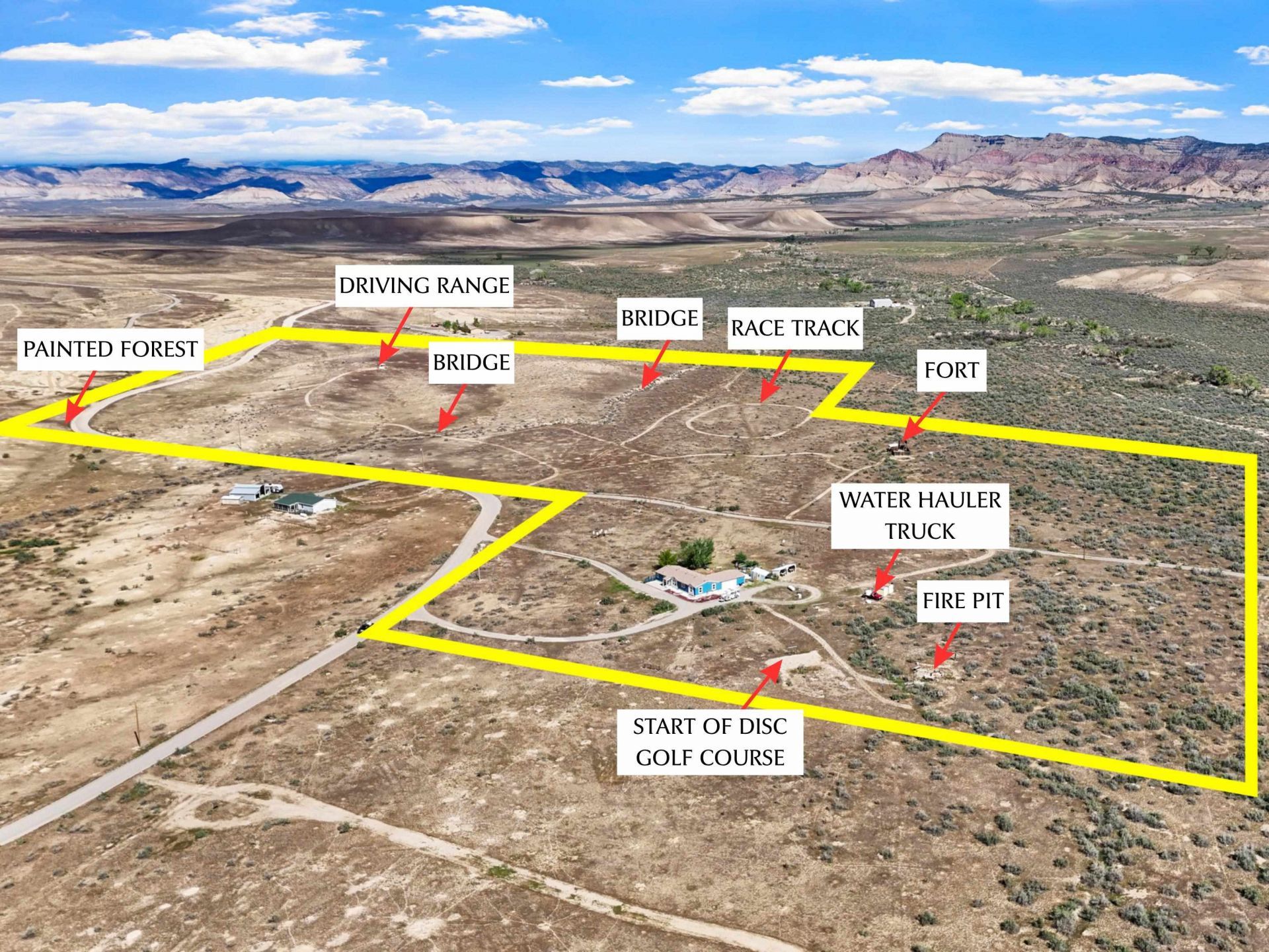 Welcome to a truly one-of-a-kind desert oasis where creativity, recreation, and wide-open space come together on 35+ acres of thoughtfully curated land. This exceptionally well-maintained home is as artful as it is inviting?offering a distinctive interior and exterior design that reflects both character and care at every turn. The property is an experience in itself. Enjoy your own private playground featuring a custom disc golf course, driving range, and a charming golf shack?perfect for honing your swing or hosting unforgettable gatherings. Explore the landscape across multiple bridges that connect unique features throughout the grounds, including a whimsical fort, an elevated observation deck with panoramic desert views, and even a race track that invites adventure and fun. Function meets freedom here, with the added value of a water-hauling truck equipped with two tanks?providing practical support for maintaining your slice of high desert paradise. Whether you're seeking a private retreat, a recreational haven, or a property that inspires creativity and connection, this extraordinary offering delivers something truly special. There is simply nothing else like it?schedule your showing and experience the magic for yourself.